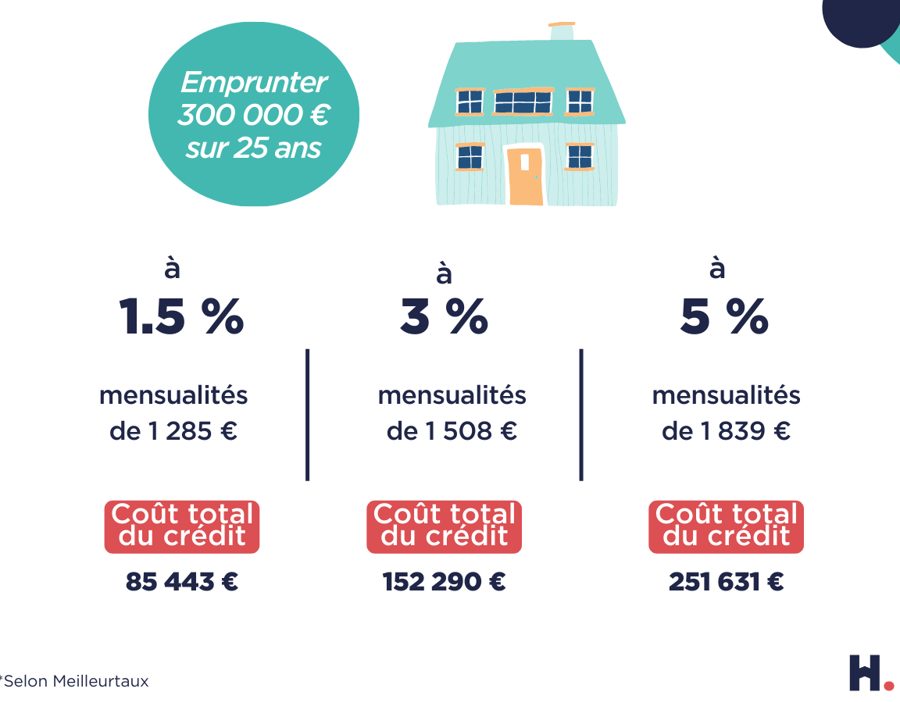 Imaginons qu’un prêt de 200 000€ soit à un taux variable de 3% la première année, avec des prévisions de hausse à 4% par la suite. Si on conserve le prêt pour 20 ans, à la fin, les intérêts totaliseraient environ 85 000€, en tenant compte des fluctuations.