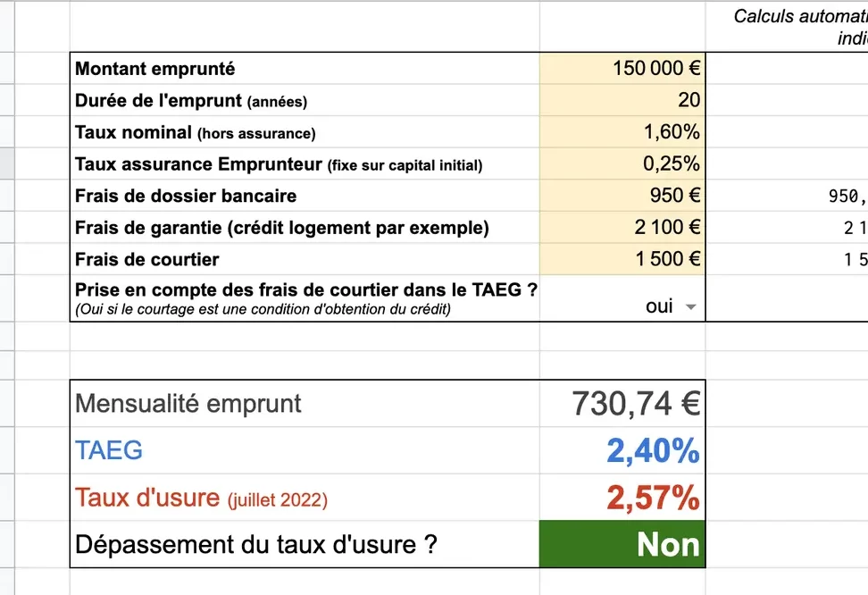 - Montant emprunté : Par exemple, un prêt de 100 000 euros à un TEG de 1,5 % et un remboursement sur 20 ans engendre des intérêts différents qu’un prêt de 50 000 euros aux mêmes conditions.