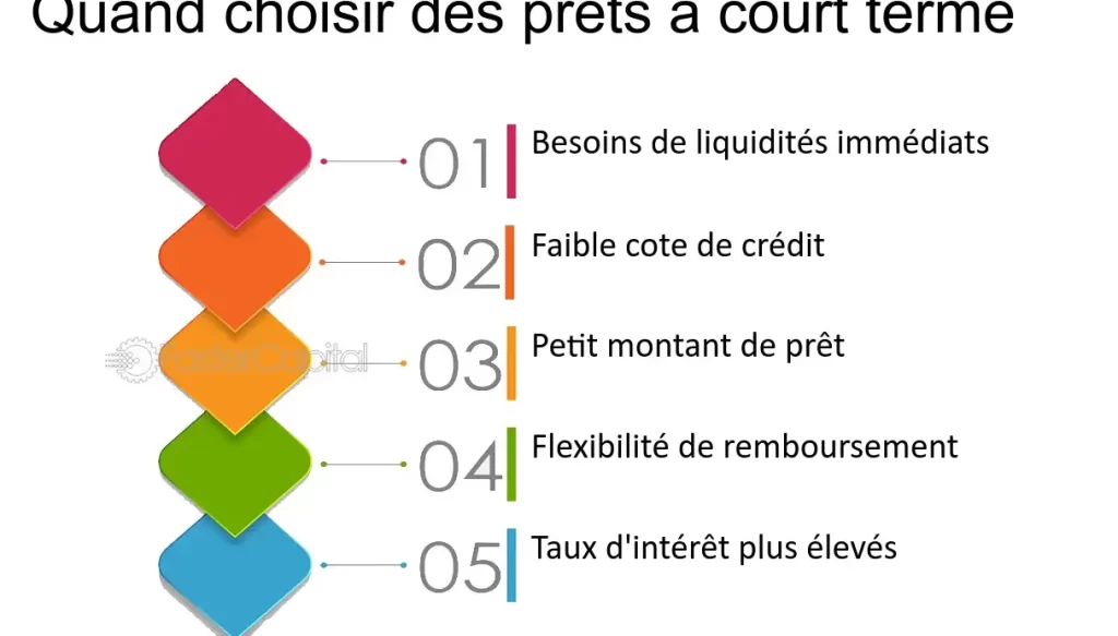 D’un autre côté, les prêts à court terme sont parfaits pour des besoins immédiats. Ils sont souvent associés à des taux d’intérêt moins élevés, ce qui réduit le coût total du prêt. De plus, la durée de remboursement courte signifie que nous devenons propriétaires plus rapidement. Cela permet un désengagement rapide de la dette et une reprise plus proactive de notre situation financière. Également, ces prêts conviennent pour des projets spécifiques ou des investissements urgents.
