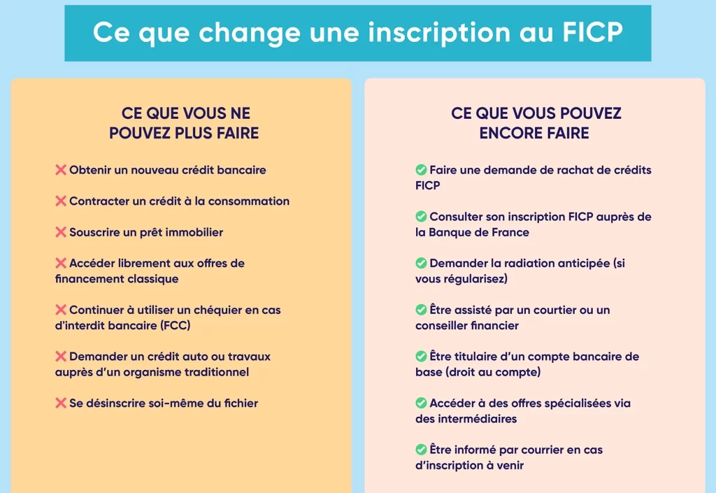 Le Fichage FICP (Fichier des Incidents de remboursement des Crédits aux Particuliers) est le principal fichier d’incidents de paiement. Il regroupe les personnes ayant des retards ou des défauts de remboursement. En général, ce fichage dure jusqu’à cinq ans après la régularisation de la situation. Il est crucial de noter que ce fichage peut avoir un impact significatif sur la capacité d’un individu à obtenir un prêt. Les établissements de crédit le consultent pour évaluer les risques avant d’accorder un financement. Une inscription au FICP peut rendre l’obtention d’un prêt classique quasi impossible.