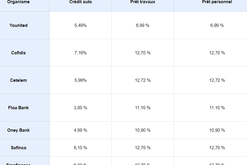 La Banque A offre un taux d’intérêt compétitif de 1,5 % sur ses prêts personnels. De plus, la durée de remboursement peut varier entre 12 et 84 mois, ce qui permet une flexibilité selon nos besoins. Les frais de dossier s’élèvent à environ 100 euros, et le service client est disponible par téléphone et chat en ligne. En cas d’urgence, leur réactivité est souvent louée par les clients.